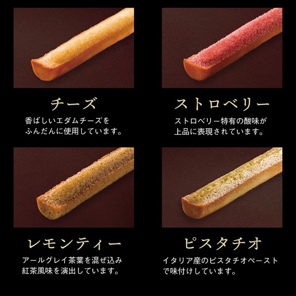 しっとりとした食感のフィナンシェを食べやすいスティック型に焼き上げた、スティックケーキ。プレーン、チョコ、チーズ、レモンティー、ピスタチオ、ストロベリーの6種のバラエティ豊かなフレーバーとカラフルな見た目がテーブルを華やかに彩ります。